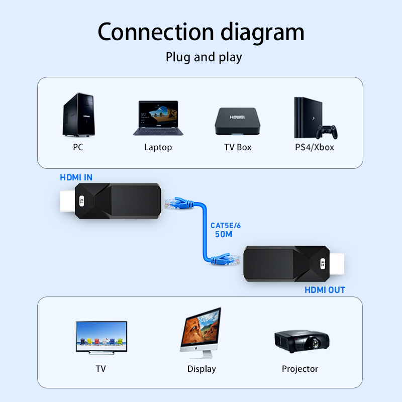 Transmits HDMI video and audio signals up to 50M over a single CAT6 cable;