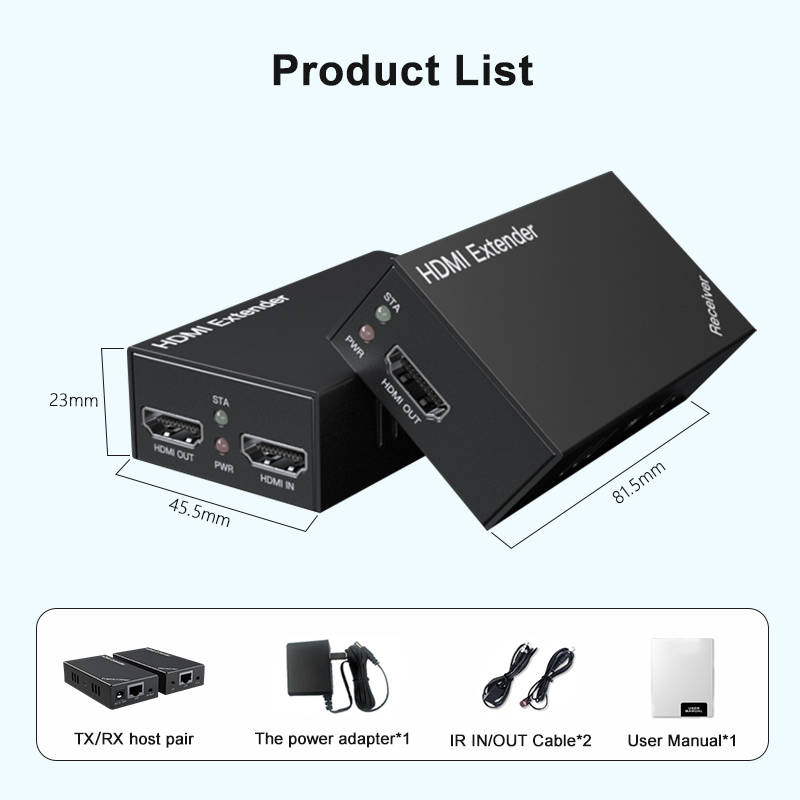 Transmits HDMI video and audio signals up to 60M over a single CAT6 cable;